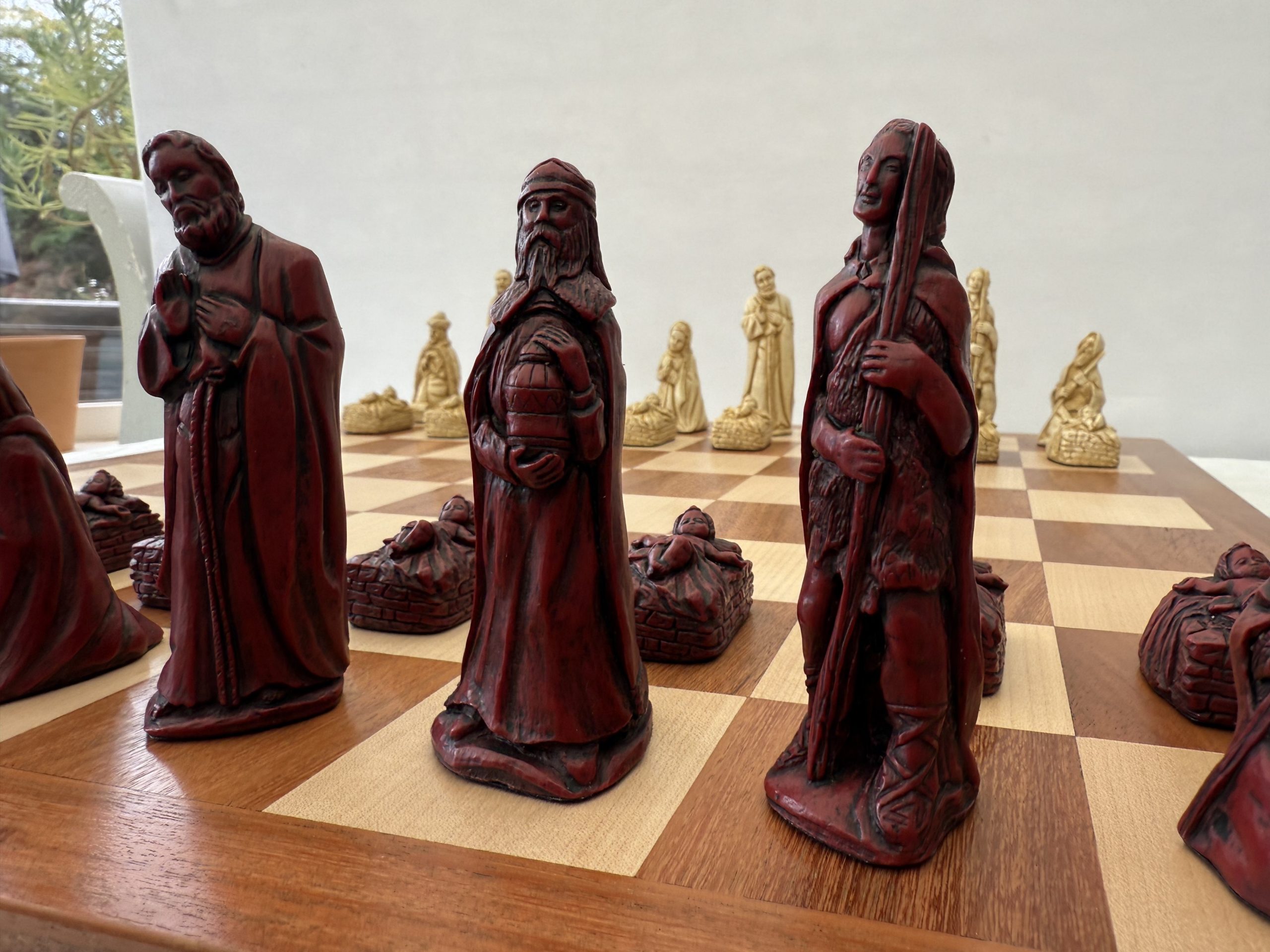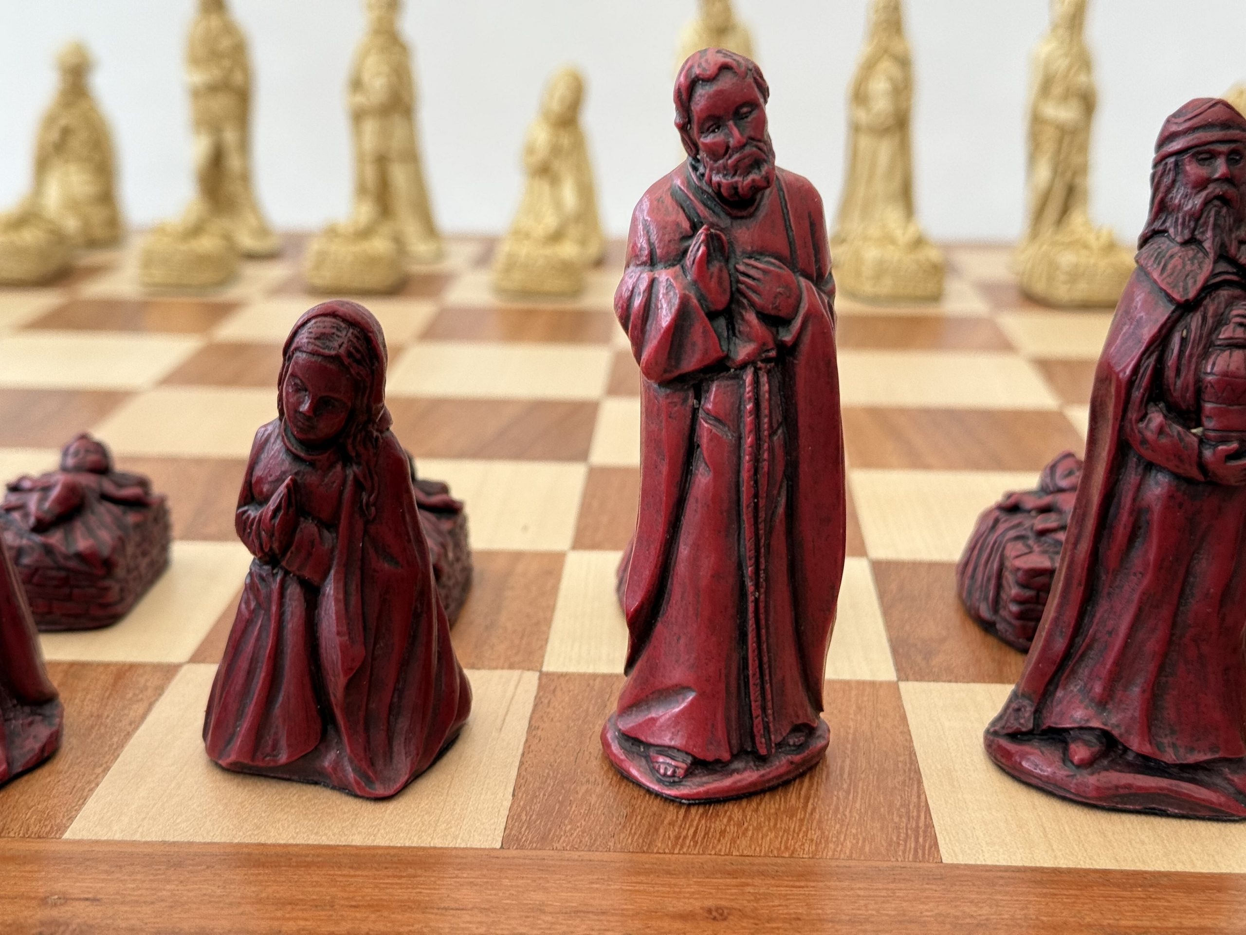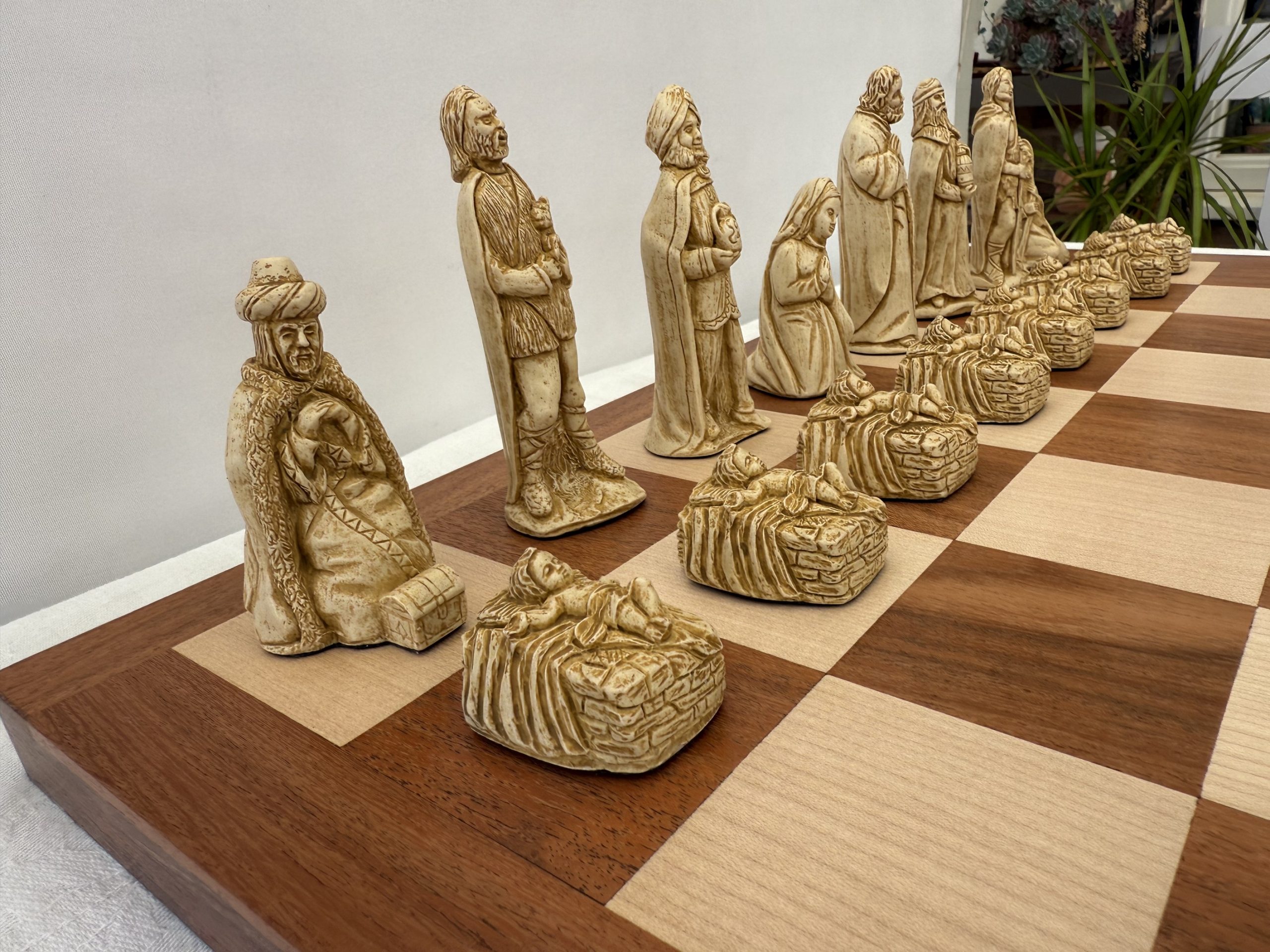 A beautifully detailed nativity scene chess set, sometimes called a Christmas chess set, featuring Joseph, Mary, shepherds, wise men, and baby Jesus as pawns. The King (Joseph) is 4″ high and nicely weighted. The chess pieces are made from crushed marble and resin. The Queen is obviously Mary. Nice detail in the chess pieces. If you prefer the dark side in brown, just say so in the order comments.