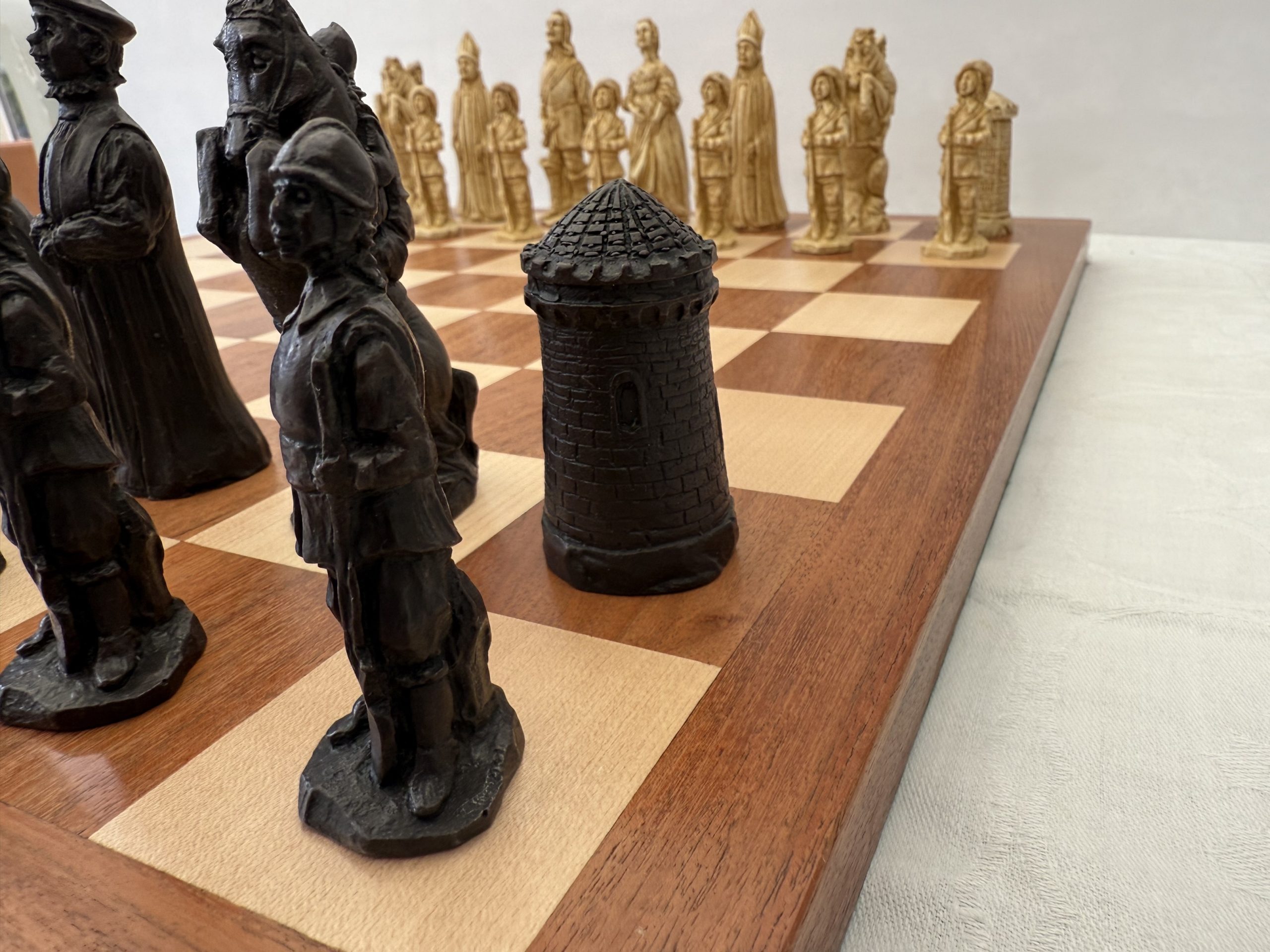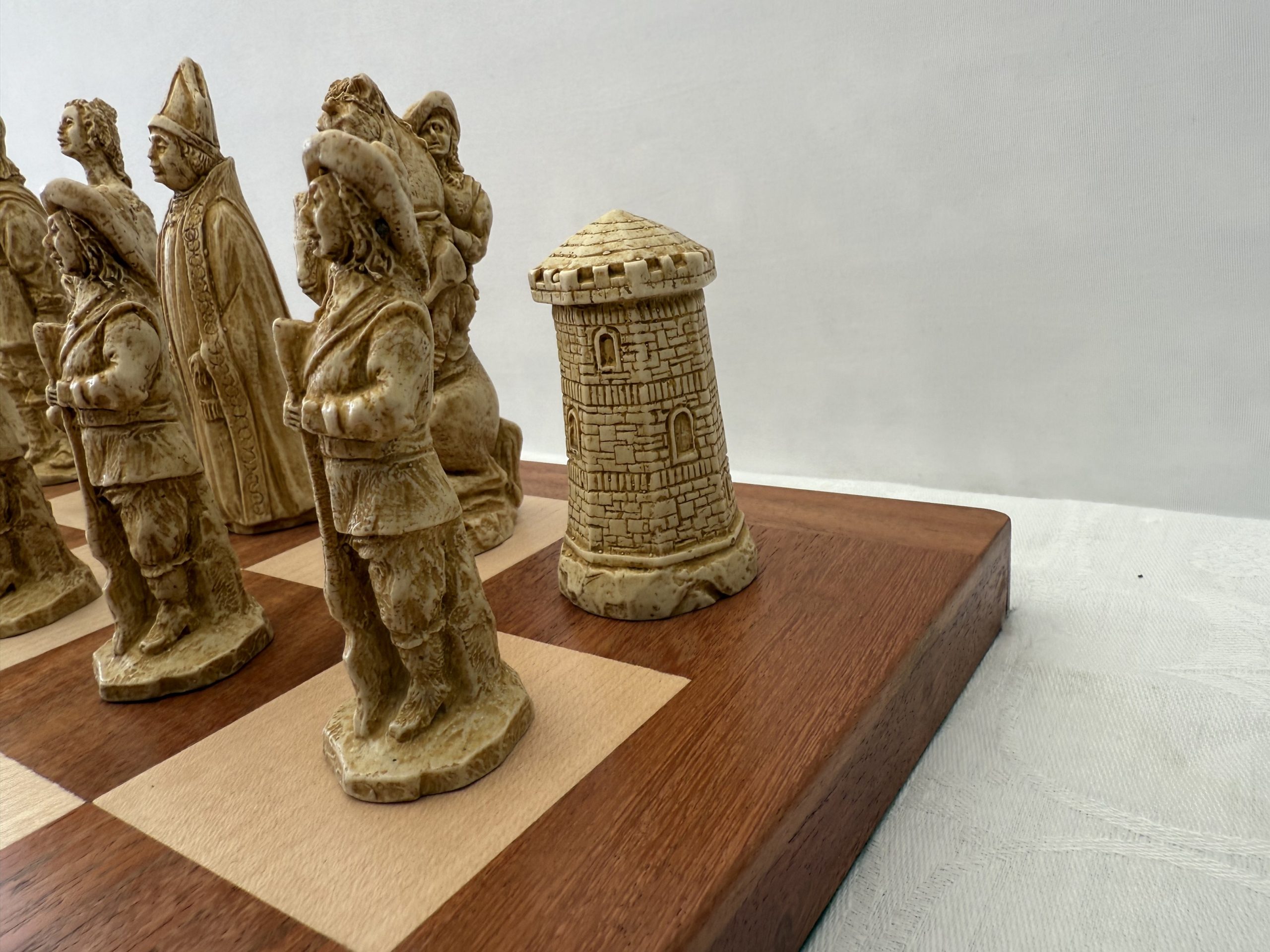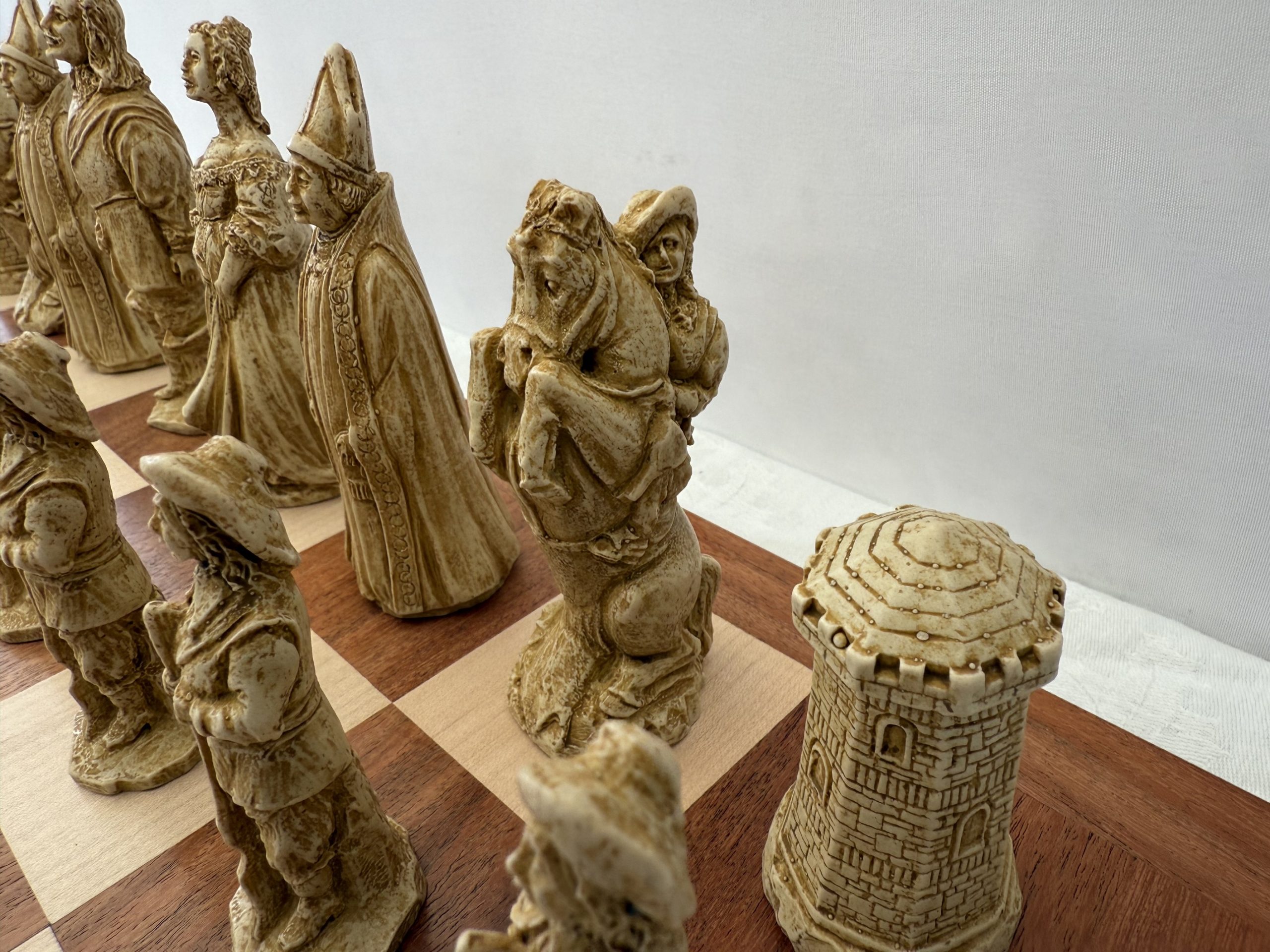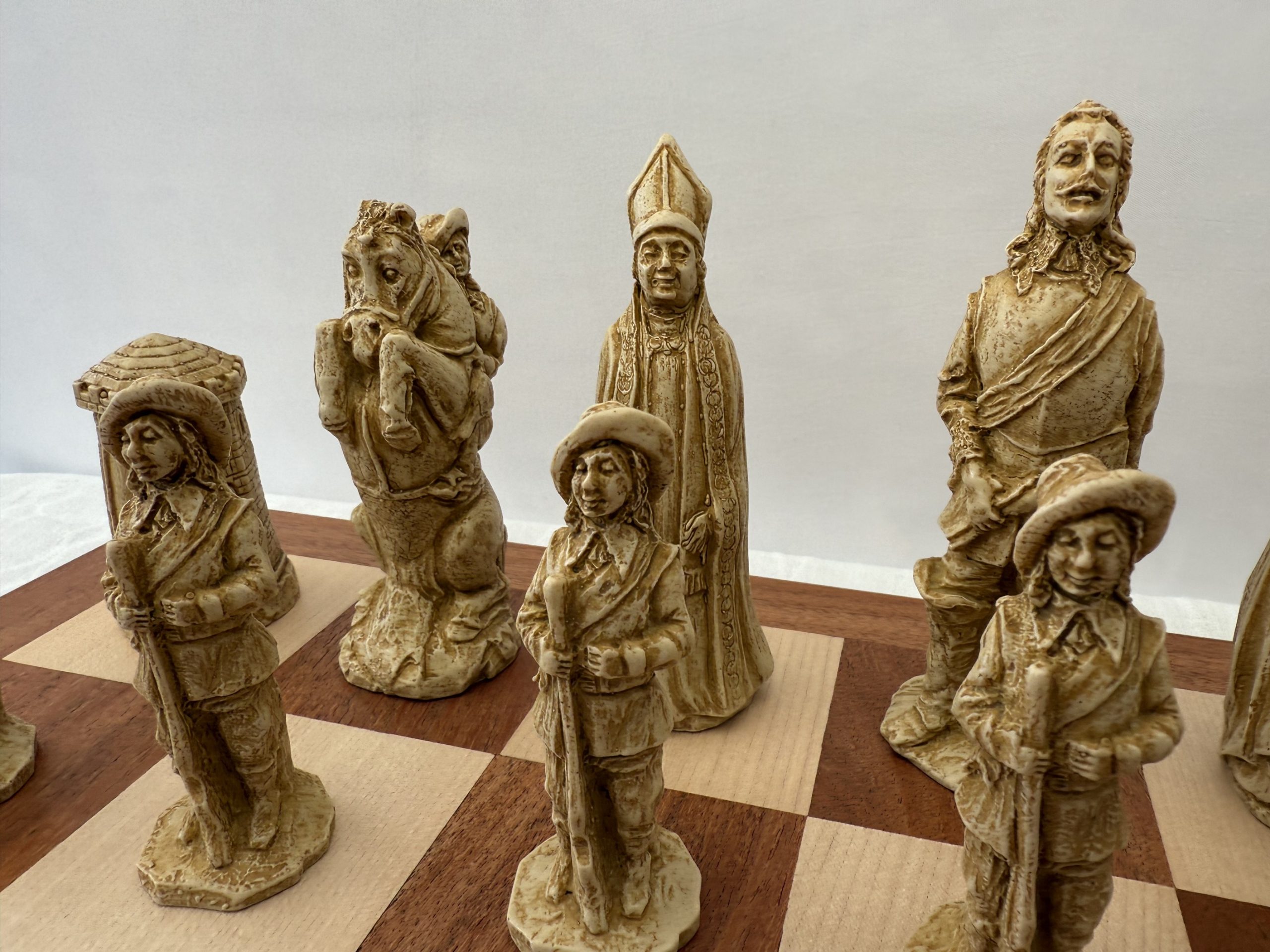 This Berkeley Chess Cavaliers vs Roundheads Chess Set brings the drama of the English Civil War of 1642-1651 to the board. Made in solid stone blended with resin, each piece has reassuring weight and detail. The white side represents the Cavaliers, loyal to the monarchy and known for elegant dress and plumed hats; the dark brown side portrays the Roundheads, the disciplined Parliamentarian forces recognised for their simpler armour and plain attire. The King stands 4 inches tall, giving the set presence without overwhelming your board.