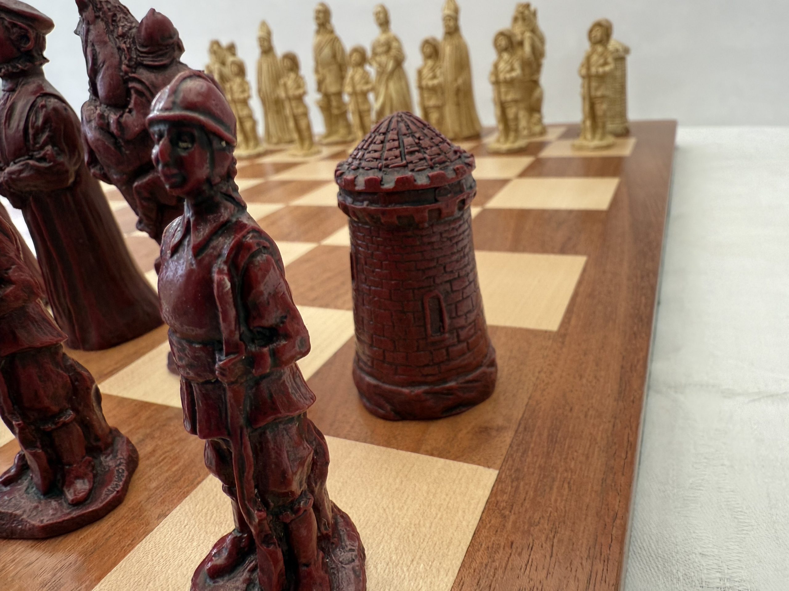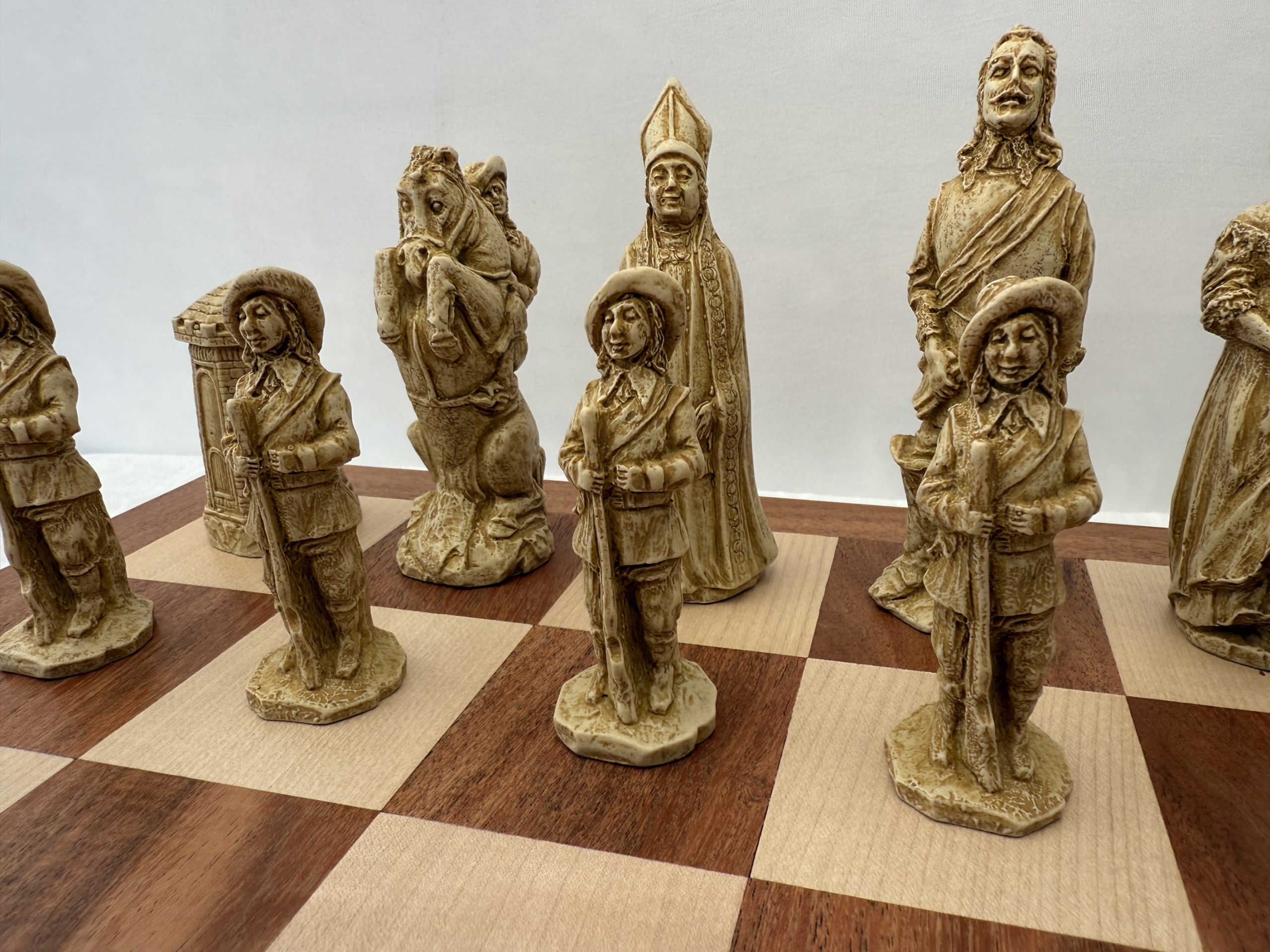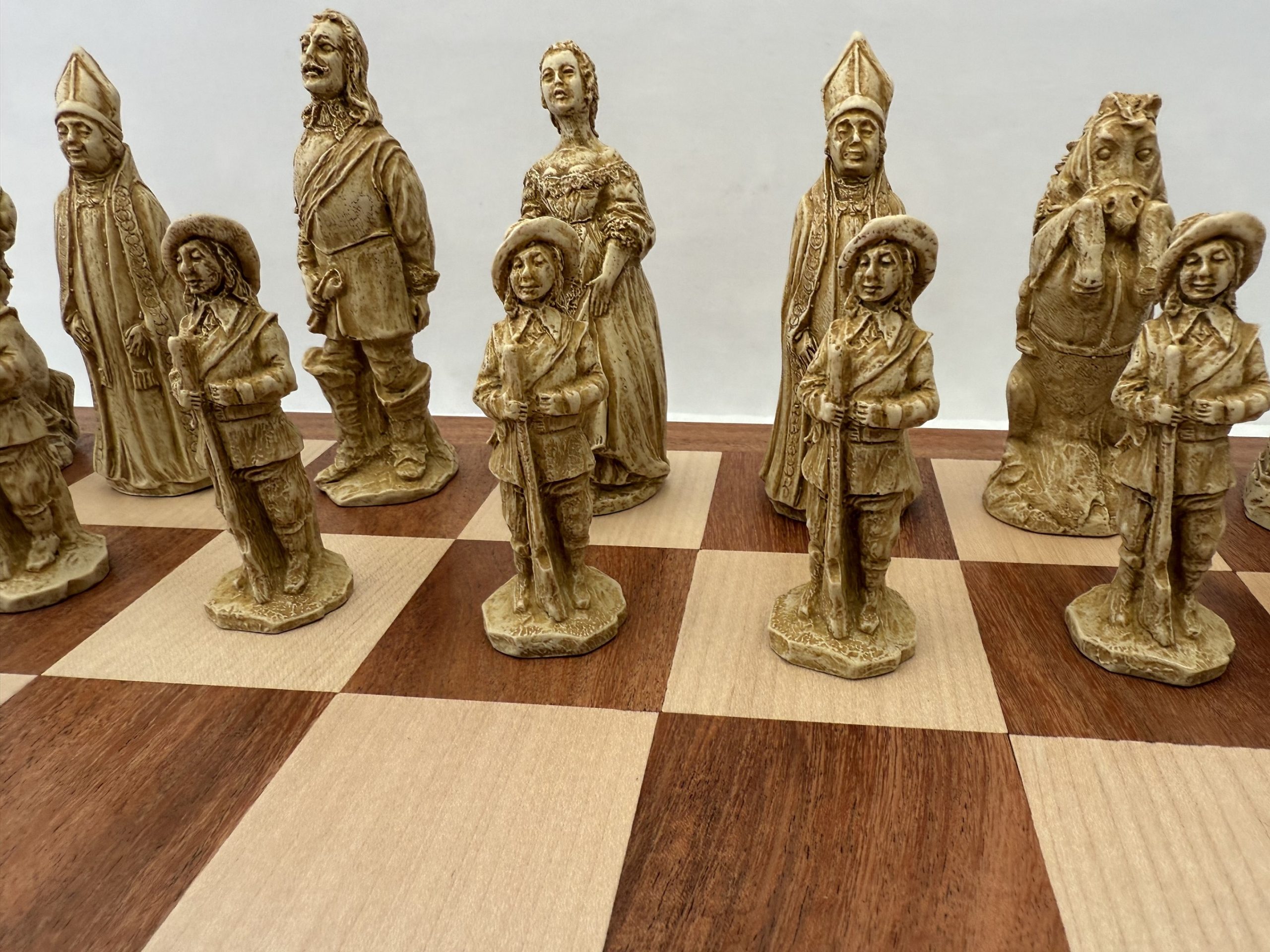 This Berkeley Chess Cavaliers vs Roundheads Chess Set brings the drama of the English Civil War of 1642-1651 to the board. Made in solid stone blended with resin, each piece has reassuring weight and detail. The white side represents the Cavaliers, loyal to the monarchy and known for elegant dress and plumed hats; the Red side portrays the Roundheads, the disciplined Parliamentarian forces recognised for their simpler armour and plain attire. The King stands 4 inches tall, giving the set presence without overwhelming your board.